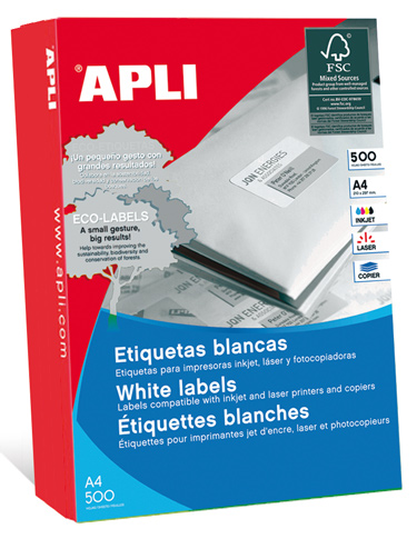 Etiquetes adhesives aptes per a làser, ink-jet i fotocopiadora. Caixes de 500 fulls A4. * El número indica la quantitat d'etiquetes per full. En impressores HP aconsellem fulls d'etiquetes amb marge. | CERTIFICAT FSC APLI.pdf